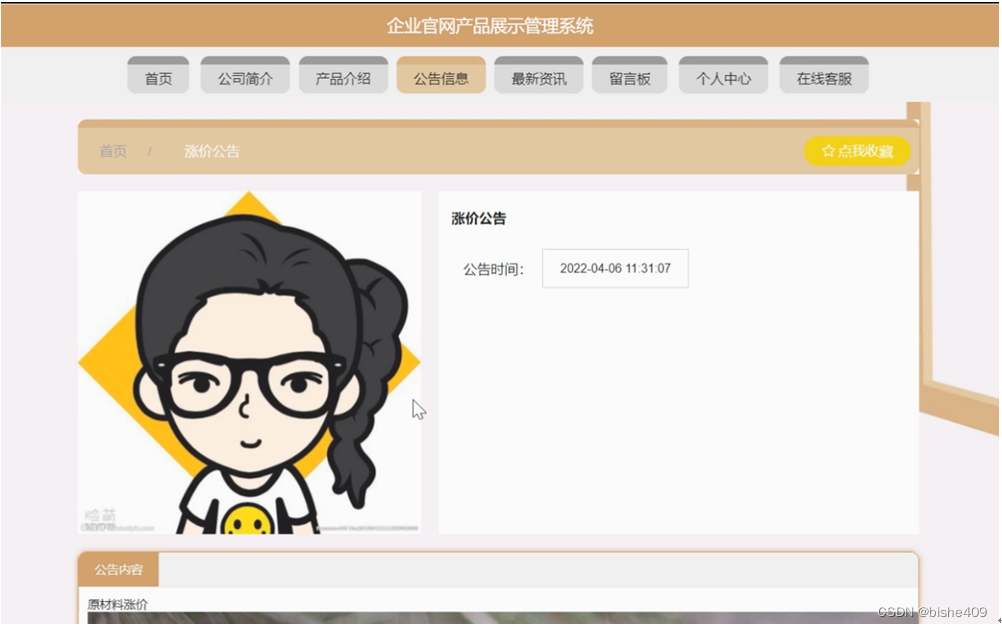 公告信息,在公告信息页面可以查看公告标题,公告图片,公告时间,公告内容等内容,并进行收藏操作,如图5-3所示。
