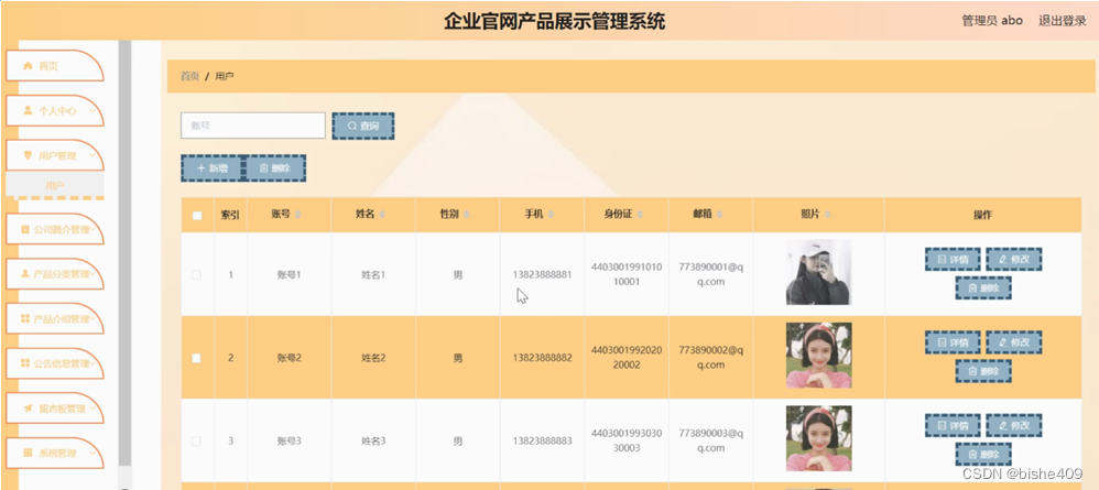 用户管理,在用户管理页面可以对索引,账号,姓名,性别,手机,身份证,邮箱,照片等内容进行详情,修改和删除等操作,如图5-7所示。