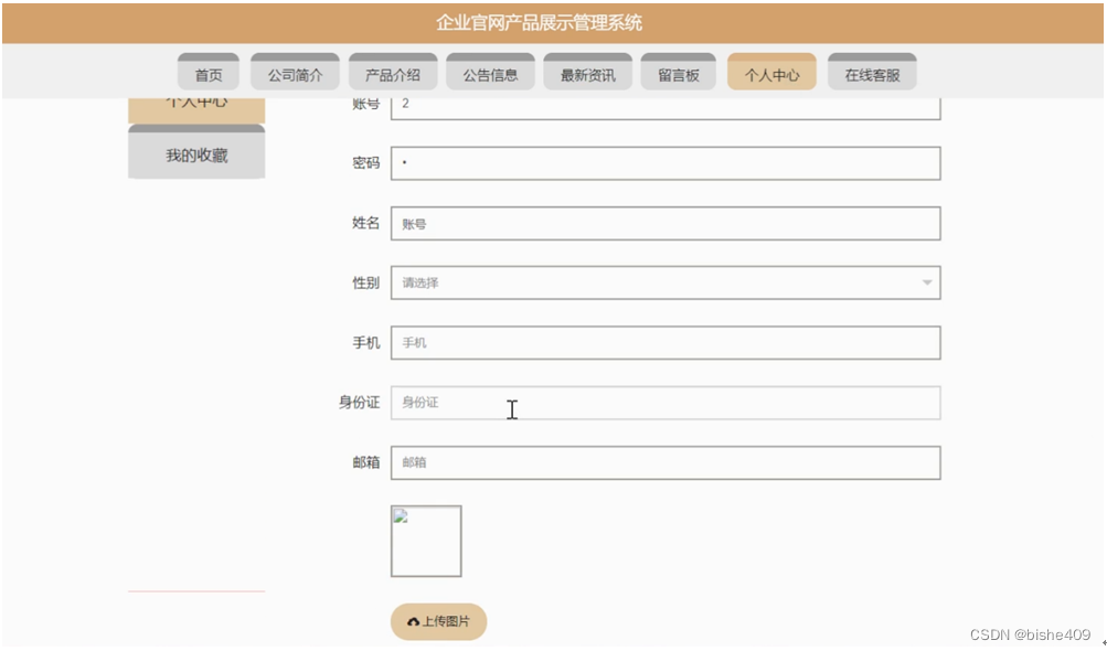 个人中心,在个人中心页面通过填写账号,密码,姓名,性别,手机,身份证,邮箱,上传图片等内容进行更新信息操作,还可以对我的收藏进行详细操作;如图5-4所示。