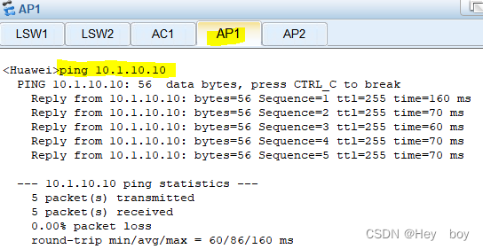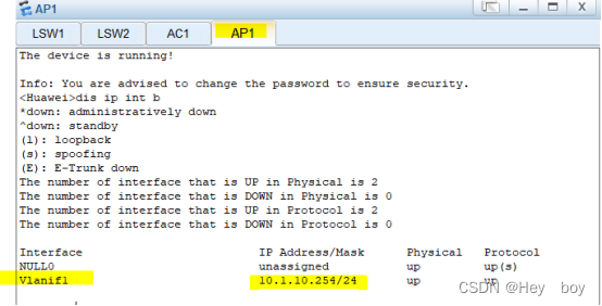 [SW1-GigabitEthernet0/0/1]port trunk pvid vlan 10 //将AP的数据帧放入vlan10中,打上vlan10数据帧的标签