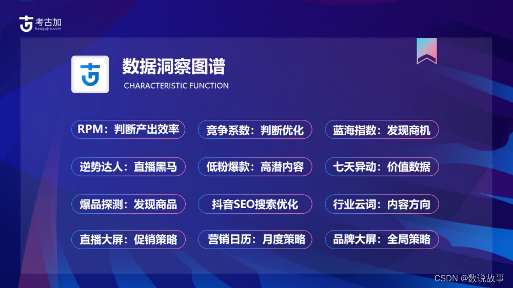考古加为品牌提供数据洞察图谱独特解析工具,对抖音生态数据进行全面且深度的商业价值挖掘,包含了逆势达人、爆品探测、抖音SEO搜索优化、营销日历等模块,辅助操盘手追踪营销效果,深挖数据洞察,实现应用提效。