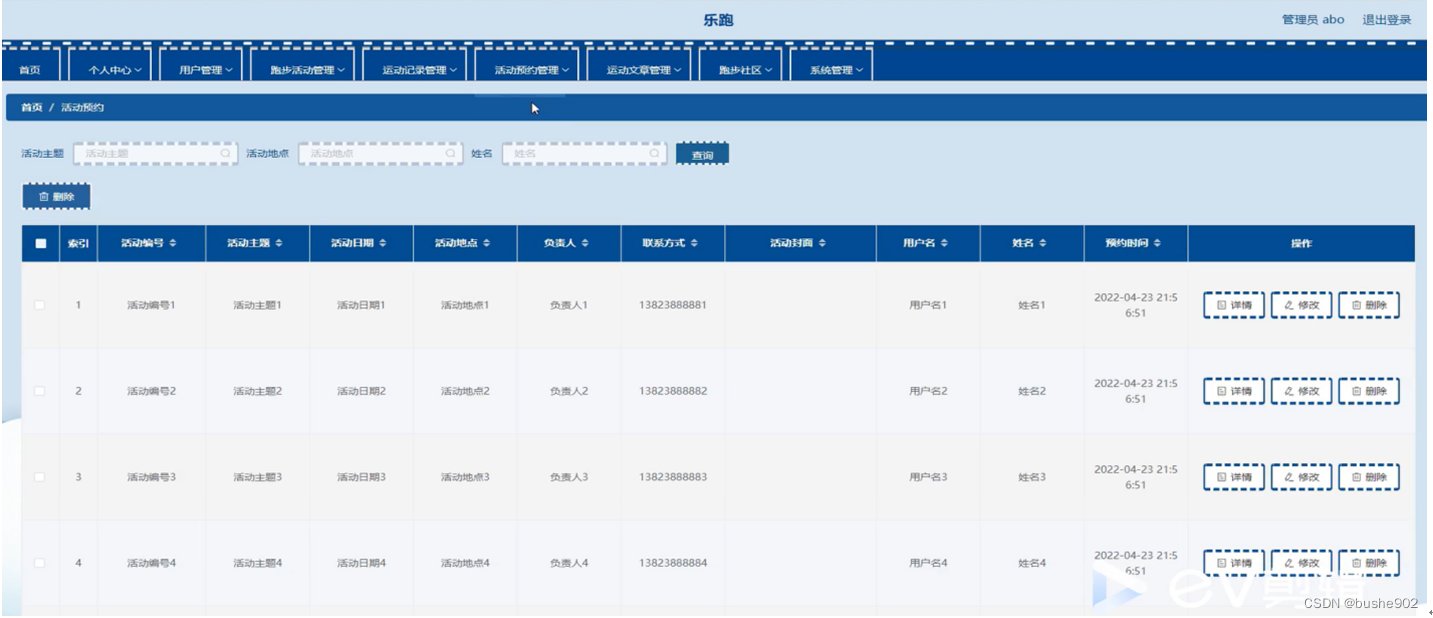 活动预约管理,在活动预约管理页面可以对活动编号、活动主题、活动日期、活动地点、负责人、联系方式、活动封面、用户名、姓名、预约时间等内容,进行详情、修改、删除等操作,活动预约管理如图5-8所示。