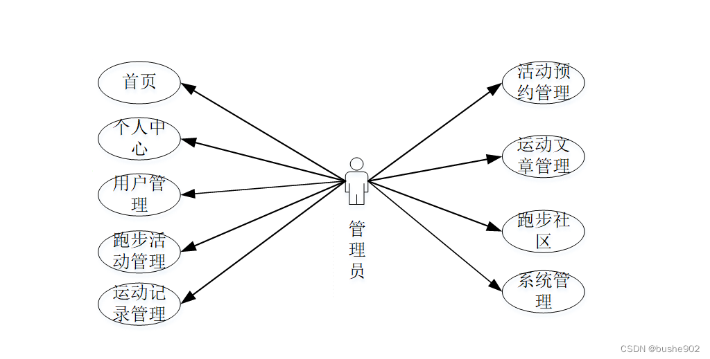 (a) 管理员;管理员使用本APP涉到的功能主要有:首页、个人中心、用户管理、跑步活动管理、运动记录管理、活动预约管理、运动文章管理、跑步社区、系统管理等功能。管理员用例图如图3-1所示。
