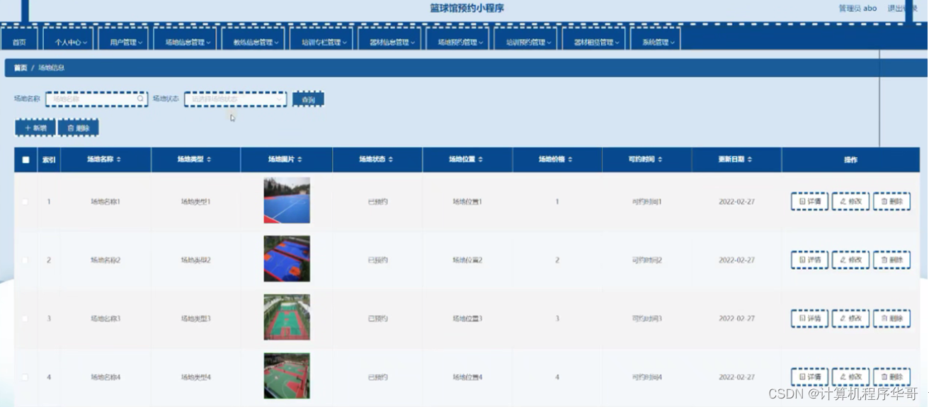 场地信息管理:在场地信息管理页面,可以查看场地名称、场地类型、场地图片、场地状态、场地位置、场地价格、可约时间、更新日期等内容,进行详情、修改、删除等操作,如图5-4所示: