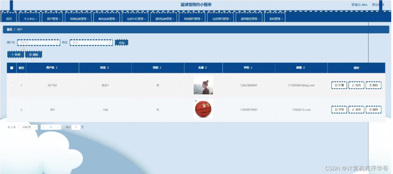 用户管理:在用户管理页面,可以查看用户名、姓名、头像、手机、邮箱等信息进行详情、修改、删除等操作,如图5-3所示: