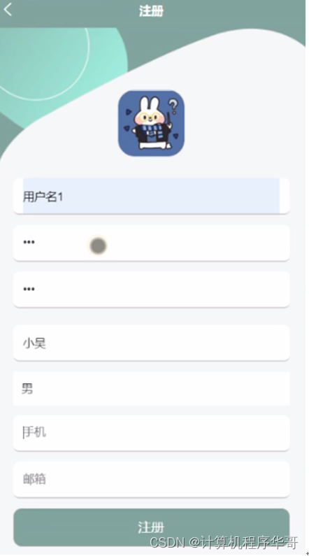 用户注册,在用户注册页面通过填写用户名、密码、确认密码、姓名、手机、邮箱等信息进行注册操作;如图5-10所示。