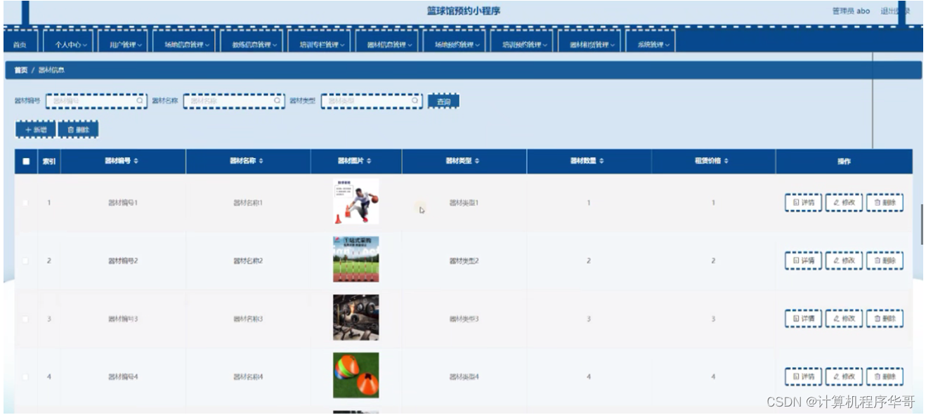 器材信息管理:在器材信息管理页面,可以查看器材编号、器材名称、器材图片、器材类型、器材数量、租赁价格等内容,还能进行详情、修改,删除,等操作,如图5-7所示: