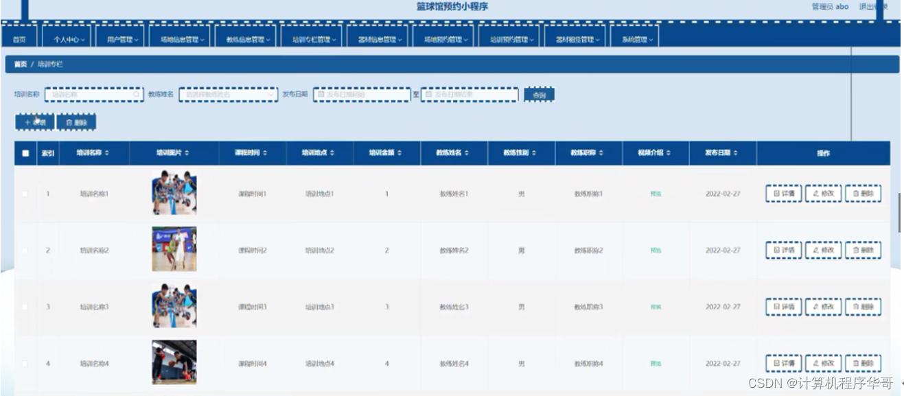 培训专栏管理:在培训专栏管理页面,可以查看培训名称、培训图片、课程时间、培训地点、培训金额、教练姓名、教练性别、教练职称、视频介绍、发布日期等内容,还能进行详情,删除等操作,如图5-6所示: