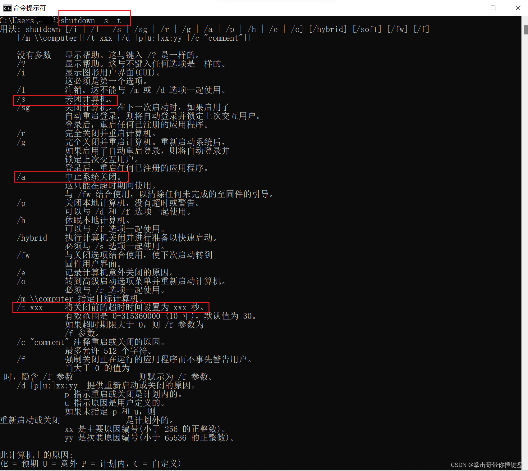 您也可以通过win键+R,弹窗口后输入cmd打开命令提示符。输入shutdown /s /t+回车打开shutdown的用法界面然后输入shutdown /s /t 60 +回车就开启了关机倒计时60秒,再输入shutdown /a +回车您就取消了关机程序。