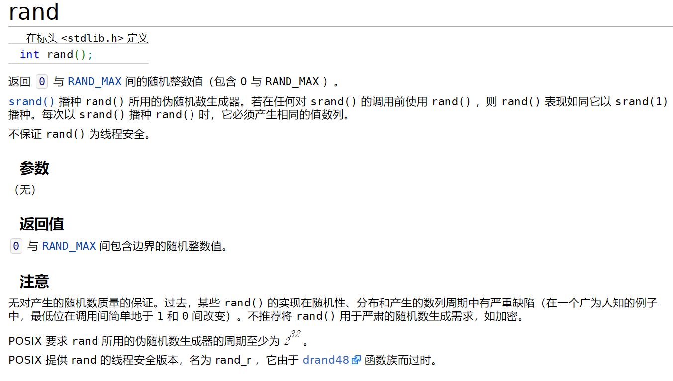 rand()函数:rand()函数是按指定的顺序来产生整数,因此每次执行该语句都打印相同的值,所以说C语言的随机并不是真正意义上的随机,有时候也叫伪随机数。