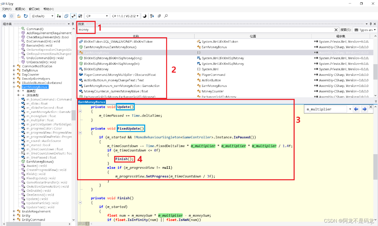 在搜索结果(图中标2所示)中,依次查看最可能有修改金钱操作的代码,这里最后锁定了”EarnMoneyBonus”类,字面意思就是“赚钱奖励”,随后点进去,发现其中有Update()和FixedUpdate()函数,这两个函数,是Unity游戏中的重要函数,其分别表示随着游戏的进行,每一帧都会调用的函数(Update)和每隔固定时间会调用的函数(FixedUpdate)。