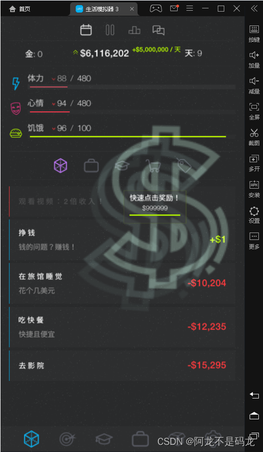 效果如图所示,每点击一次挣钱,获得的是999999金钱,和前面反编译出的C#源码中,num=m_moneySum*(m_multiplier-1)计算结果一致,其中m_multiplier为倍率,被我们修改为1000000了,而m_moneySum为1,因此每点击一次得到999999