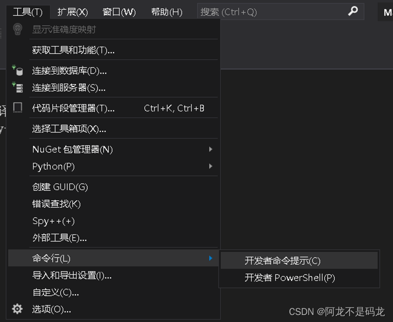之后,可以在Visual Studio的“工具”,“命令行(L)”中选择“开发者命令提示(C)”,如图所示: