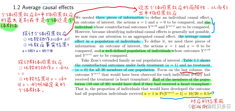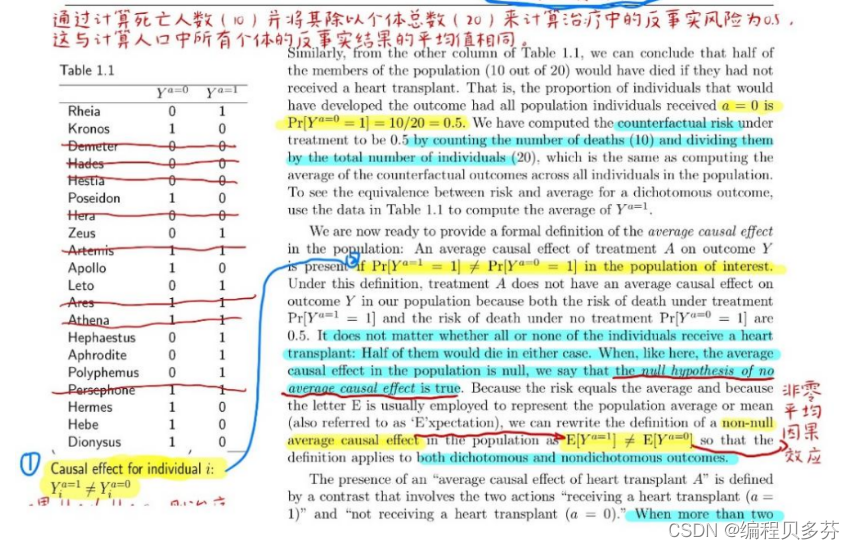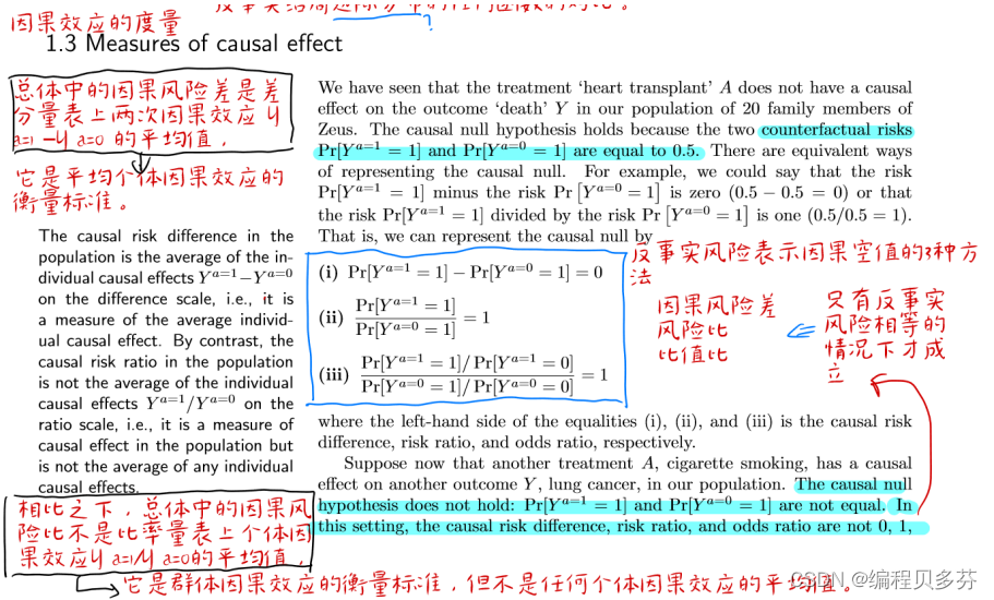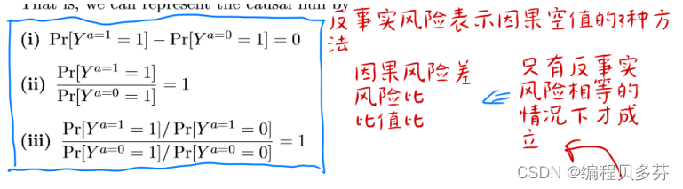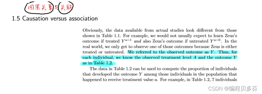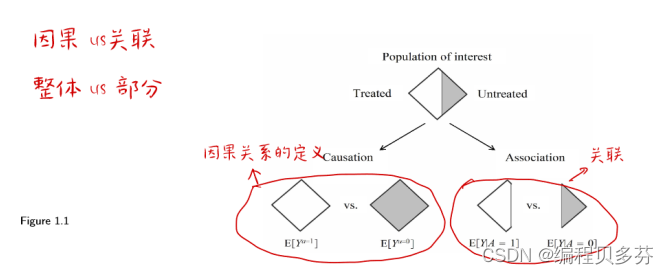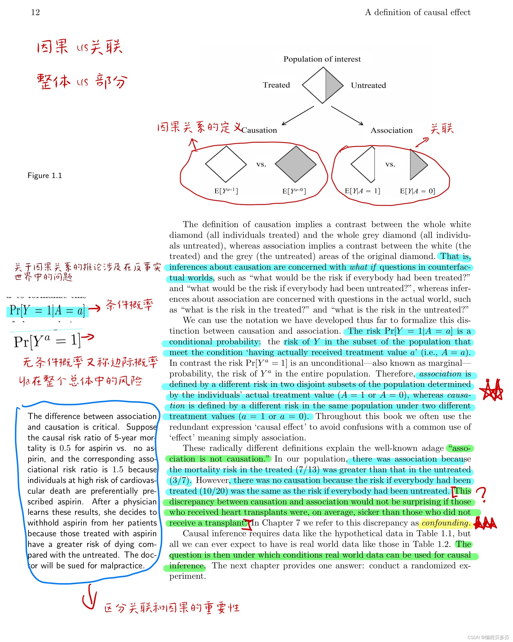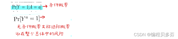 因果和关联的区别:关联是由个体的实际治疗值(A = 1 或 A = 0)确定的两个不相交的人群子集中的不同风险定义的,而因果关系是由同一人群中的不同风险定义的在两个不同的处理值(a = 1 或 a = 0)下