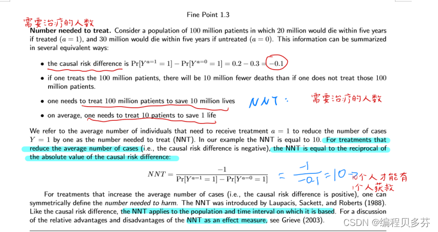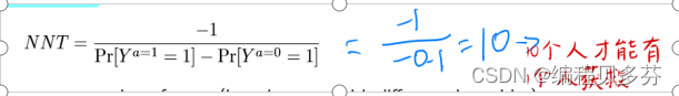 - 对于减少平均病例数的治疗(即因果风险差异为负),NNT 等于因果风险差异绝对值的倒数