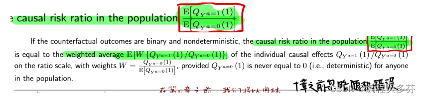 因果风险比:相比之下,总体中的因果风险比不是比率量表上个体因果效应Y a=1/Y a=0的平均值——它是群体因果效应的衡量标准,但不是任何个体因果效应的平均值