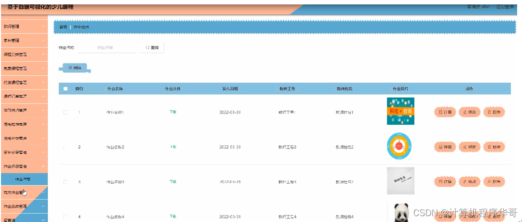 作业信息管理,在作业信息管理页面可以对索引,作业名称,作业文件,发布日期,教师工号,教师姓名,作业图片等内容进行详情,修改,删除操作,如图5-11所示。