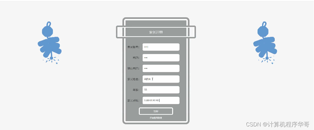 家长注册,在家长注册页面通过填写家长账号,密码,确认密码,家长姓名,年龄,家长手机等信息进行注册操作,如图5-2所示。