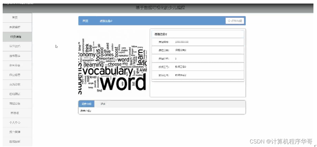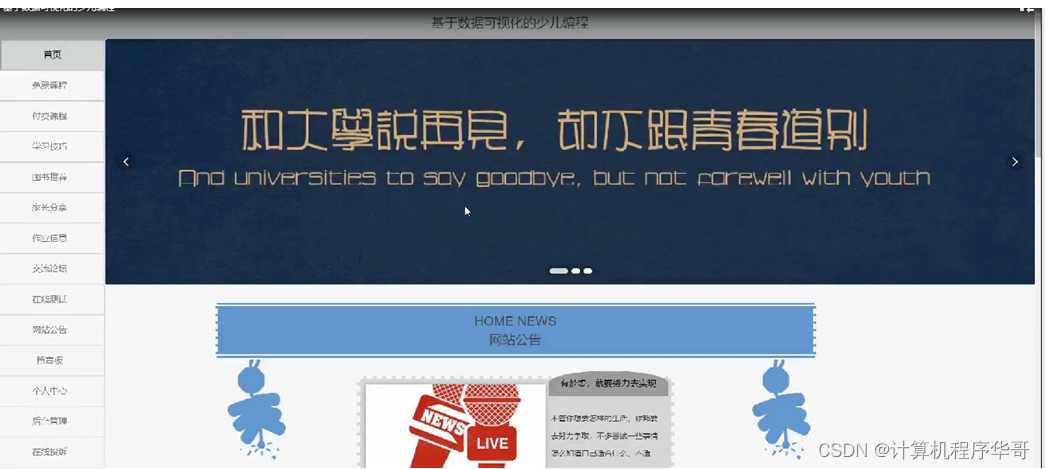 基于数据可视化的少儿编程系统,在系统首页可以查看首页,免费课程,付费课程,学习技巧,图书推荐,家长分享,作业信息,交流论坛,在线测试,网站公告,留言板,个人中心,后台管理,在线投诉等内容,并进行详细操作;如图5-1所示。