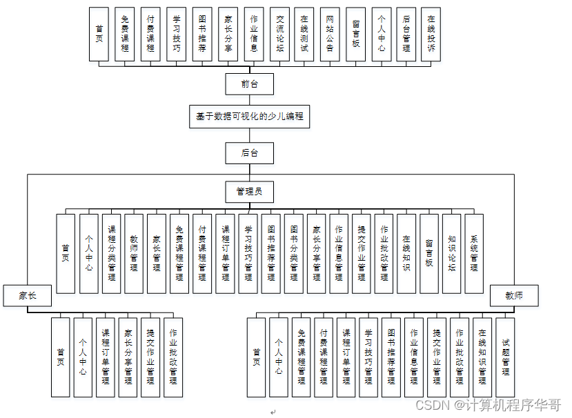管理员功能包括首页,个人中心,教师管理,家长管理,课程分类管理,免费课程管理,付费课程管理,课程订单管理,学习技巧管理,图书分类管理,家长分享管理,图书推荐管理,作业信息管理,提交作业管理,作业批改管理,在线知识管理,留言板,知识论坛,系统管理等。