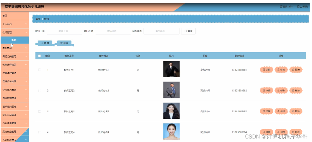 教师管理,在教师管理页面可以对索引,教师工号,教师姓名,性别,图片,职称,联系电话等内容进行详情,修改和删除等操作,如图5-7所示。