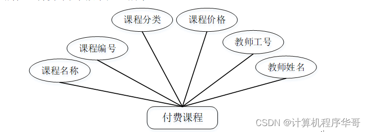 付费课程包括课程名称,课程编号,课程分类,课程价格,教师工号,教师姓名等属性。付费课程图如图4-3所示: