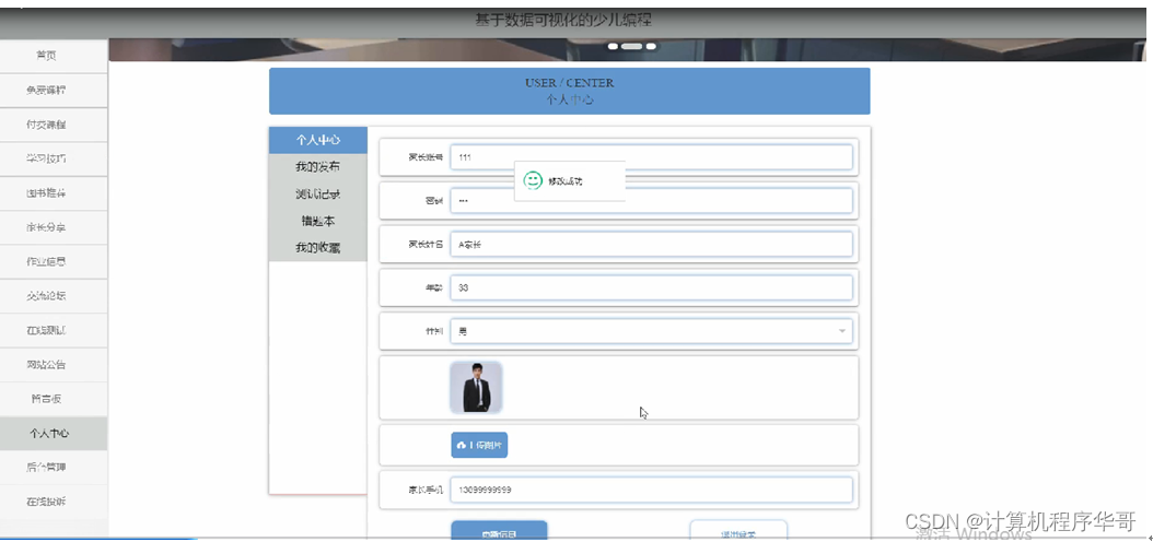 个人中心,在个人中心页面通过填写家长账号,密码,家长姓名,年龄,性别,图片,手机等内容进行更新信息操作,还可以进行我的发布,测试记录,错题本,我的收藏等操作;如图5-4所示。