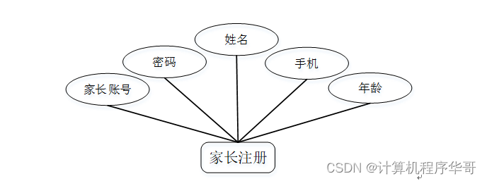 家长注册实体包括 家长账号,密码,家长姓名,年龄,家长手机等属性。家长注册实体图如图4-2所示: