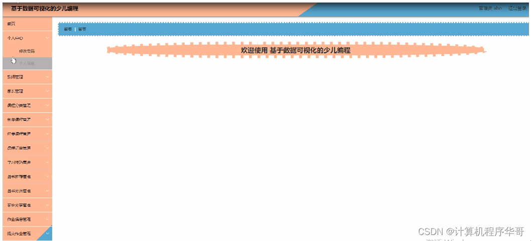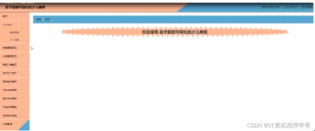 教师登录进入基于数据分析可视化的少儿编程系统可以对首页,个人中心,免费课程管理,付费课程管理,课程订单管理,学习技巧管理,图书推荐管理,作业信息管理,提交作业管理,作业批改管理,在线知识管理,试题管理等功能进行相应操作,如图5-12所示。