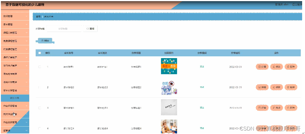 家长分享管理,在家长分享管理页面可以对索引,家长账号,家长姓名,分享标题,封面图片,分享视频,分享时间等内容进行详情,修改,删除操作,如图5-10所示。