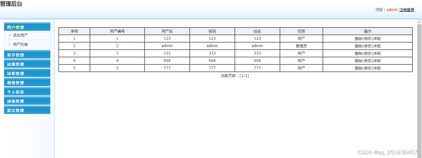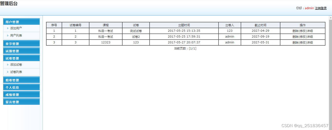 (4)试卷管理:对试卷信息进行添加、删除、修改和查看