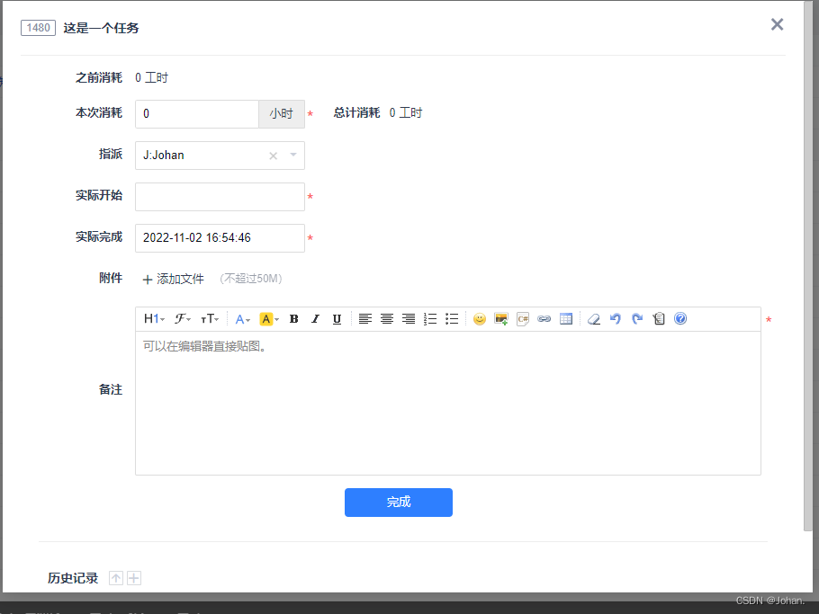 前面找到了任务下面就来根据任务的信息自动计算任务工时,把“本次消耗”、“实际开始”、“实际完成”以及“备注”四个输入框填上对应的内容(因为这些是必填项),再点“完成”按钮禅道就会把任务状态更新为“已完成”。