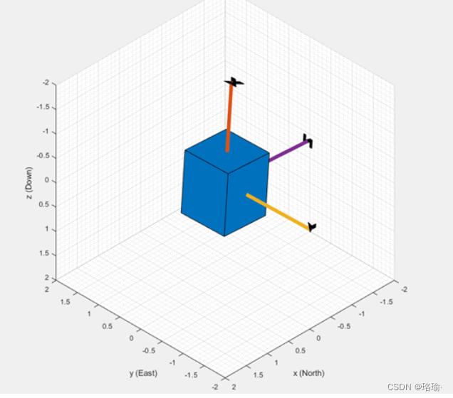 此示例中使用的传感器融合算法使用东北向下 (NED) 作为固定的父坐标系。在NED参考系中,X轴指向北方,Y轴指向东,Z轴指向下方。根据算法的不同,北可以是磁北,也可以是真北。此示例中的算法使用磁北。此处使用的算法期望对象中的所有传感器的轴对齐,并符合NED惯例。