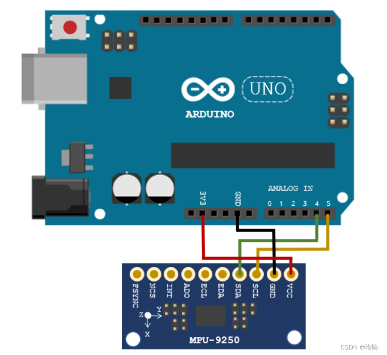 将 MPU-9250 传感器的 SDA、SCL、GND 和 VCC 引脚连接到 Arduino® 硬件上的相应引脚。此示例使用具有以下连接的 Arduino Uno 板: