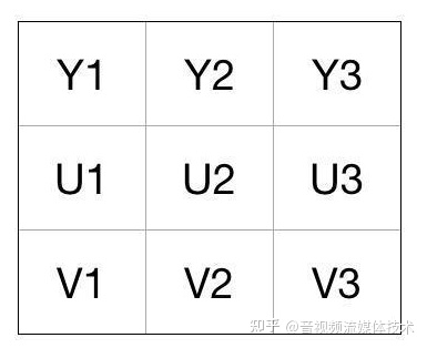 YUV420P:三平面存储。数据组成为YYYYYYYYUUVV(如I420)或YYYYYYYYVVUU(如YV12)。