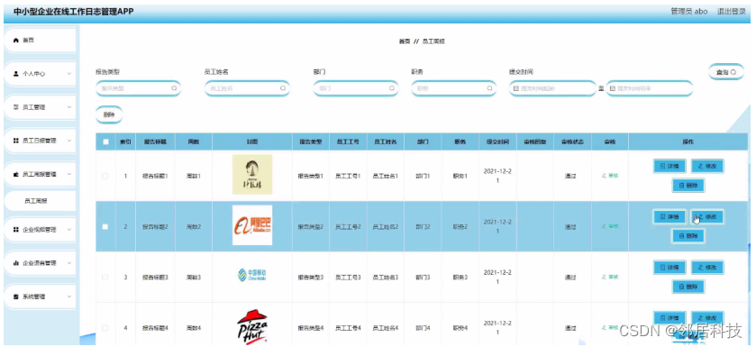 员工日报管理,在员工日报管理页面可以对报告标题、时间、封面、报告类型、员工工号、员工姓名、部门、职务、审核回复、审核状态、审核等内容进行详情、修改、删除等操作,如图5-5所示。