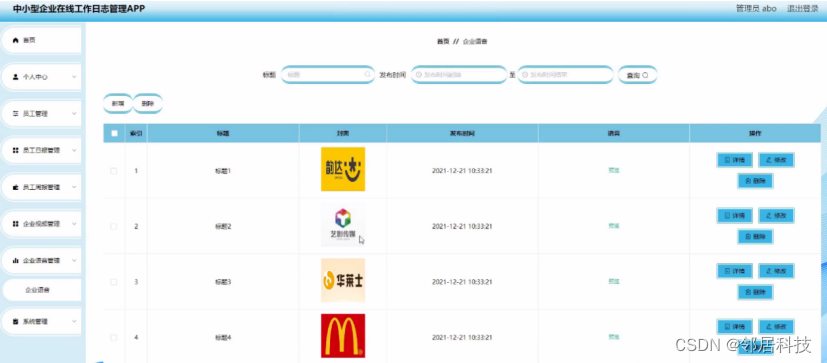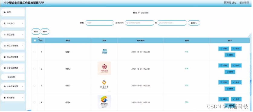 企业视频管理,在企业视频管理页面可以对标题、封面、发布时间、视频等内容进行详情、修改、删除等操作,如图5-7所示。