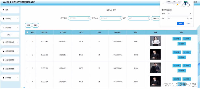 员工管理,在员工管理页面可以对员工工号、员工姓名、部门、性别、联系电话、职务、头像等内容进行详情、修改、删除等操作,如图5-4所示。