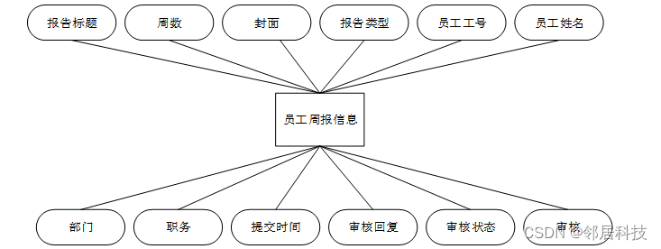 员工周报管理,在员工周报管理页面可以对报告标题、周数、封面、报告类型、员工工号、员工姓名、部门、职务、提交时间、审核回复、审核状态、审核等内容进行详情、修改、删除等操作,如图5-6所示。