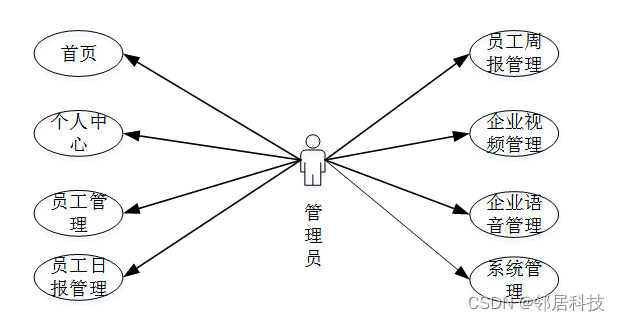 (a) 管理员;管理员使用本APP涉到的功能主要有:首页、个人中心、员工管理、员工日报管理、员工周报管理、企业视频管理、企业语音管理、系统管理等功能。管理员用例图如图3-1所示。