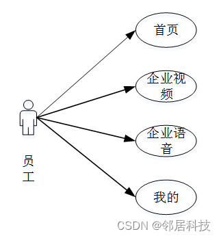(b) 员工;进入前端APP可以实现首页、企业视频、企业语音、我的等功能进行操作。员工用例图如图3-2所示。
