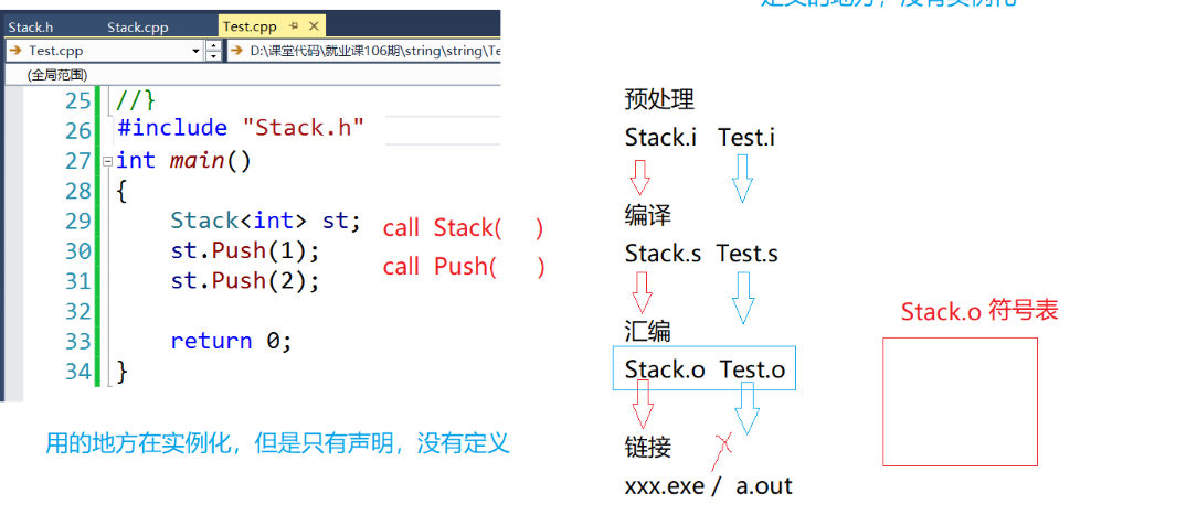 分文件编写在预处理的时候,并不会实例化定义中的类型,但是这并不影响接下来的编译与汇编,一直到链接的时候去符号找的时候才发现没有实例化而报错。