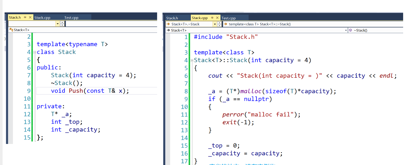 注意:我们在类外定义函数的时候,需要在类名的后面加上 <T> 。其中T是你 template 定义的时候尖括号中取的名字。