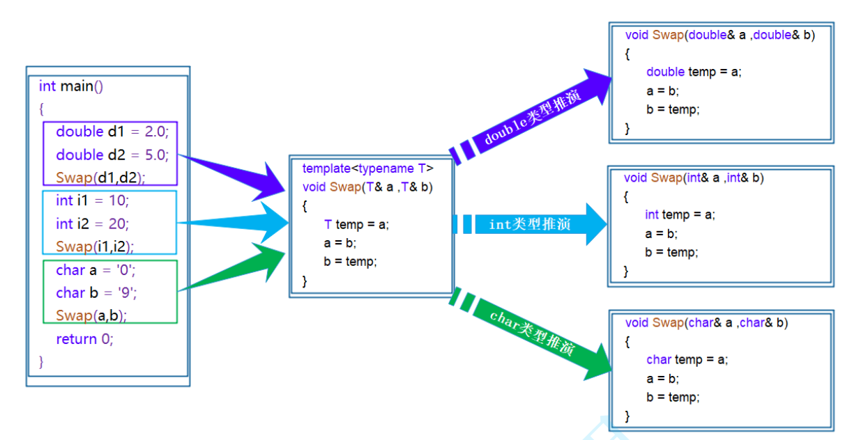 在编译器编译阶段,对于模板函数的使用,编译器需要根据传入的实参类型来推演生成对应类型的函数以供调用。比如:当用double类型使用函数模板时,编译器通过对实参类型的推演,将T确定为double类型,然后产生一份专门处理double类型的代码,对于字符类型也是如此。