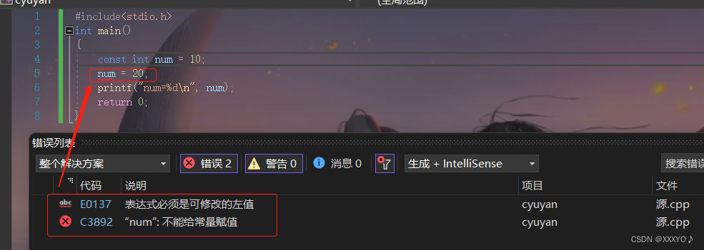 此时可以正常输出,而当使用const修饰后,num即成为10,就不可变了,这时num=20就是错误的