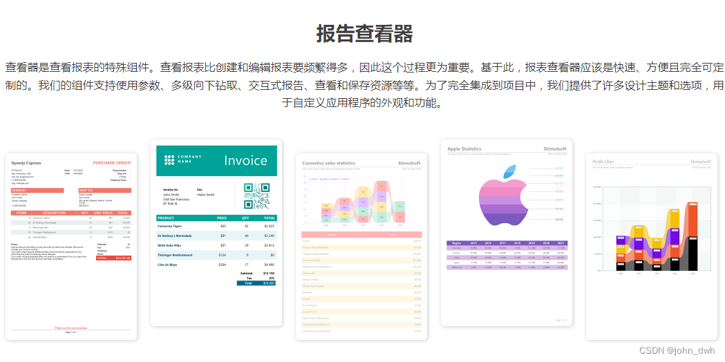 查看器是查看报表的特殊组件。查看报表比创建和编辑报表要频繁得多,因此这个过程更为重要。基于此,报表查看器应该是快速、方便且完全可定制的。我们的组件支持使用参数、多级向下钻取、交互式报告、查看和保存资源等等。为了完全集成到项目中,我们提供了许多设计主题和选项,用于自定义应用程序的外观和功能。