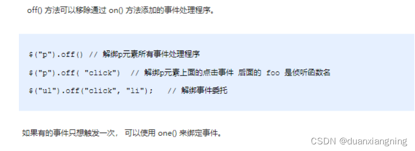 当某个事件上面的逻辑,在特定需求下不需要的时候,可以把该事件上的逻辑移除,这个过程我们称为事件解绑。jQuery 为我们提供 了多种事件解绑方法:die() / undelegate() / off() 等,甚至还有只触发一次的事件绑定方法 one(),在这里我们重点介绍 off() ;