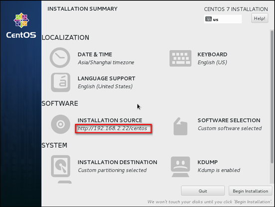 修改引导配置文件,将安装选项中的 “inst.stage2=hd:LABEL=CentOS\x207\x20x86_64”改为“inst.ks=http://192.168.2.22/ks.cfg”