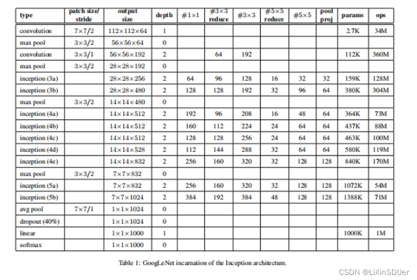 “#3×3reduce”和“#5×5reduce”表示在3×3和5×5卷积之前的减少层中使用的1×1卷积核的数量