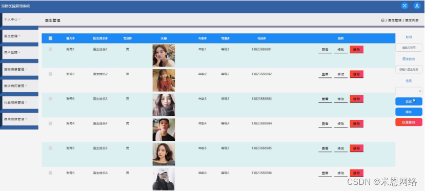 在医生管理页面,管理员可以对账号、医生姓名、性别、头像、年龄、等级、电话等信息进行查看、修改、删除或添加、批量删除等操作,如图5-11所示。